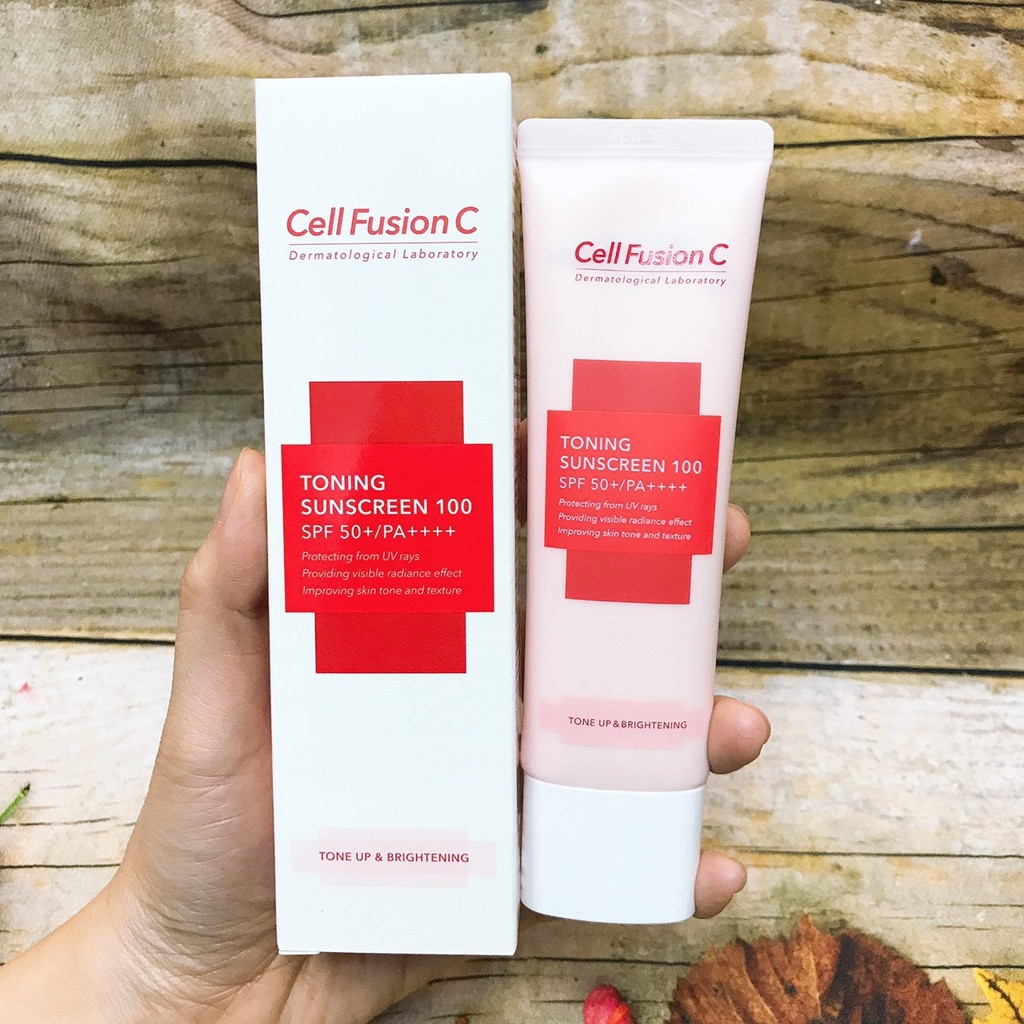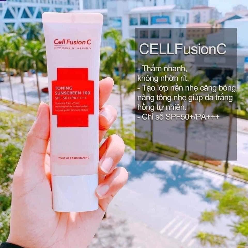 - Kem chống nắng Cell Fusion C Toning Sunscreen 100 có chỉ số chống nắng hoàn hảo. SPF 50+ PA+++ là chỉ số được chuyên gia gia liễu khuyến nghị sử dụng để bảo vệ da trước UVA và UVB. Cũng là chỉ số chống nắng mà dòng kem này đang sở hữu và được khuyến nghị nên sử dụng.