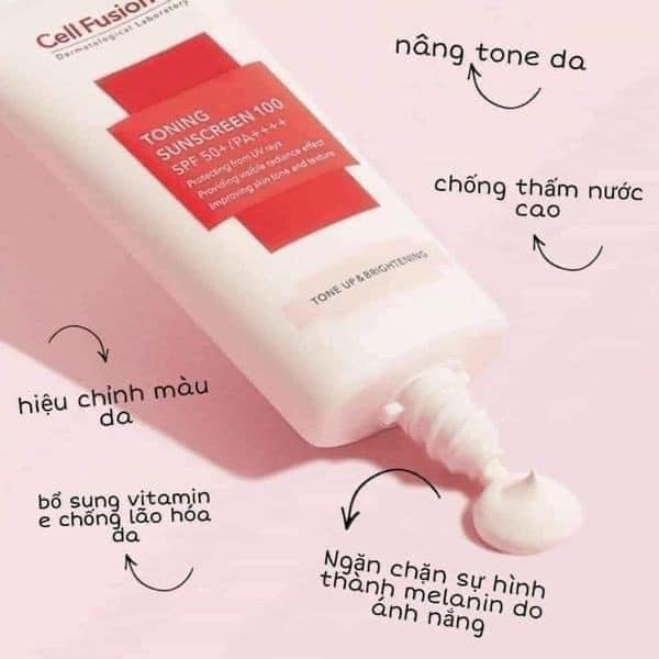 - Kem chống nắng Cell Fusion C Toning giúp chống lại các tác nhân gây hại từ môi trường, UV. SPF lý tưởng để ngăn chặn nám, đồi mồi, nếp nhăn do UVA gây ra và bảo vệ da không bị cháy đen. Ngăn chặn da khô sạm bởi tác động của tia tử ngoại. Cung cấp độ ẩm + Coq10, collagen nuôi dưỡng làn da, chống lão hóa