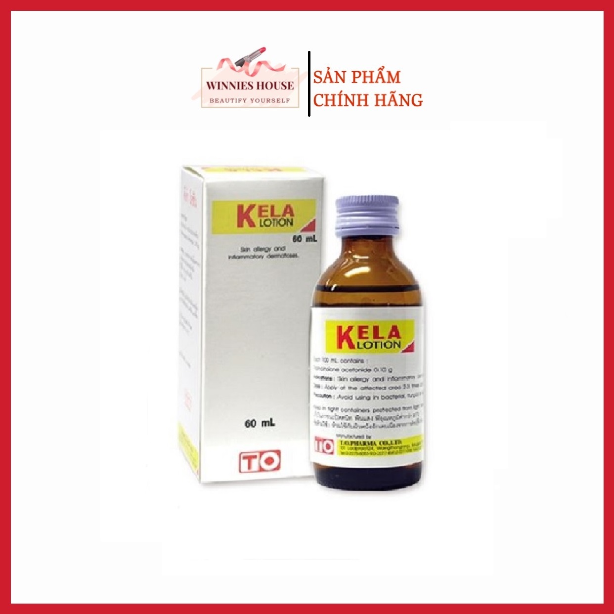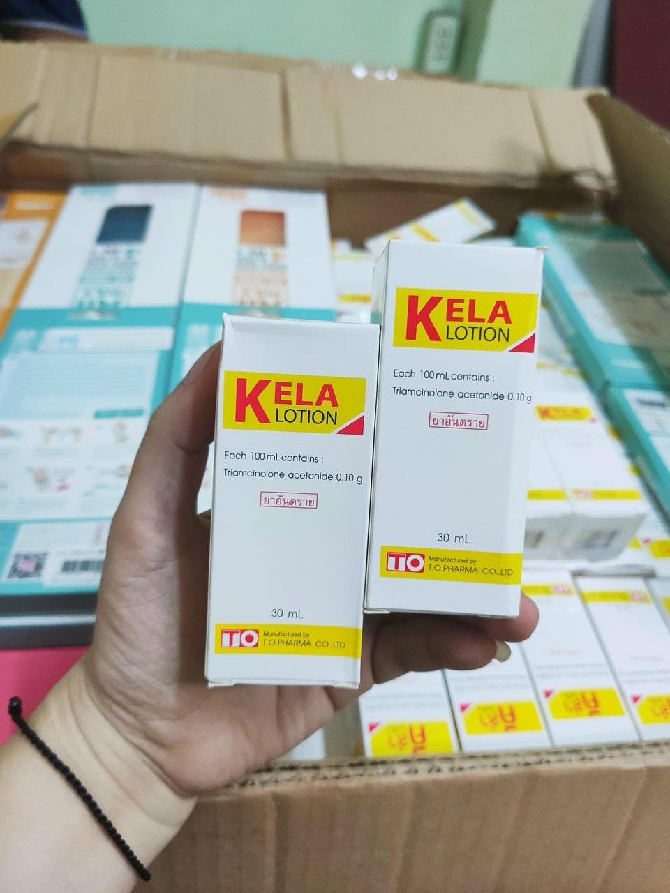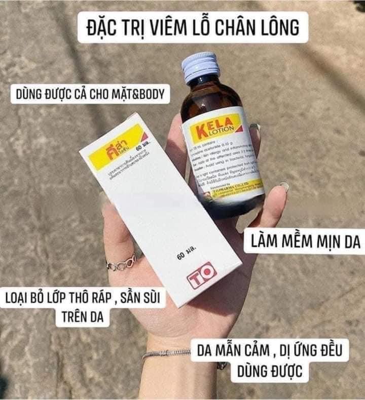 - Đây là loại dưỡng thể dạng lỏng, dược phẩm sử dụng ngoài da được điều chế dựa trên tác động của Triamcinolone acetonide, là một hocmon glucocorticoid có nguồn gốc tổng hợp. Thuốc trị viêm lỗ chân lông Thái Lan Kela lotion có tác dụng chống viêm, chống phù và chống dị ứng. Nó được dùng để điều trị với các bệnh lý của da như trị viêm lỗ chân lông.