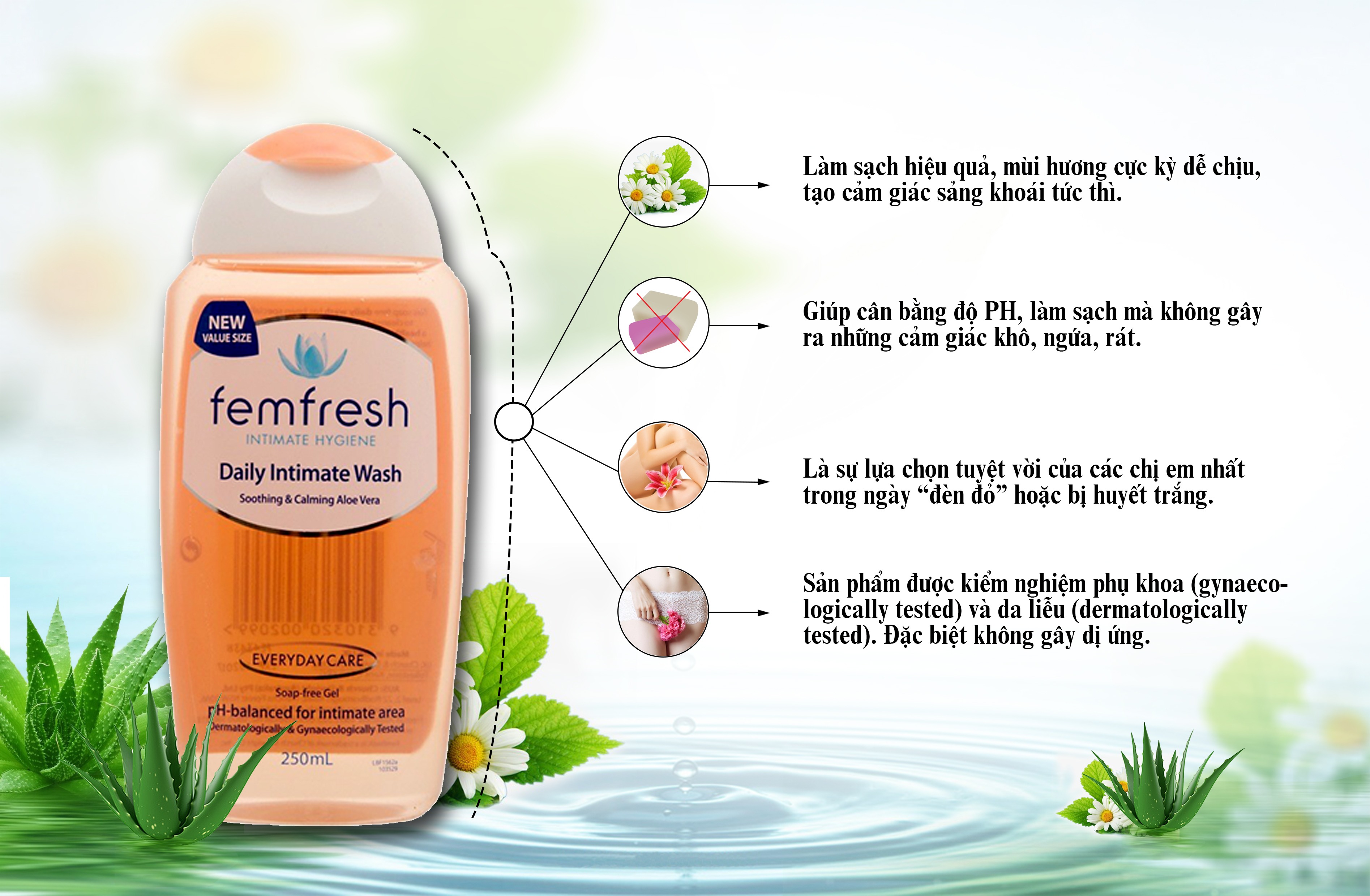 + Dung dịch vệ sinh Femfresh với công thức dịu nhẹ, làm sạch nhẹ nhàng, duy trì môi trường lí tưởng cho "vùng nhạy cảm", giúp ngăn ngừa và hỗ trợ điều trị các bệnh phụ khoa, để chị em phụ nữ luôn khoẻ mạnh, tự tin.