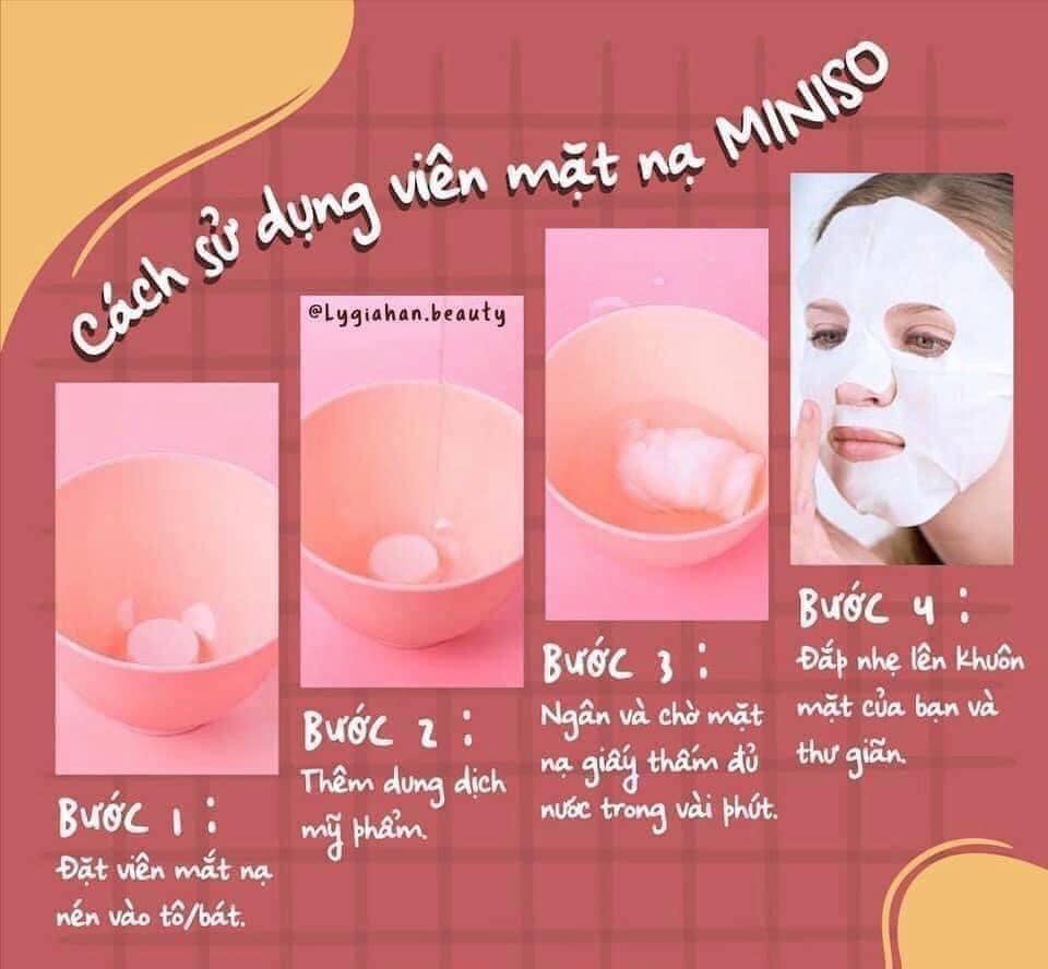 - Chỉ cần cho Mặt nạ giấy nén Miniso vào nước hoặc lotion, toner,nước ép hoa quả, sữa tươi… trong giây lát viên mặt nạ nở ra là dùng được ngay.