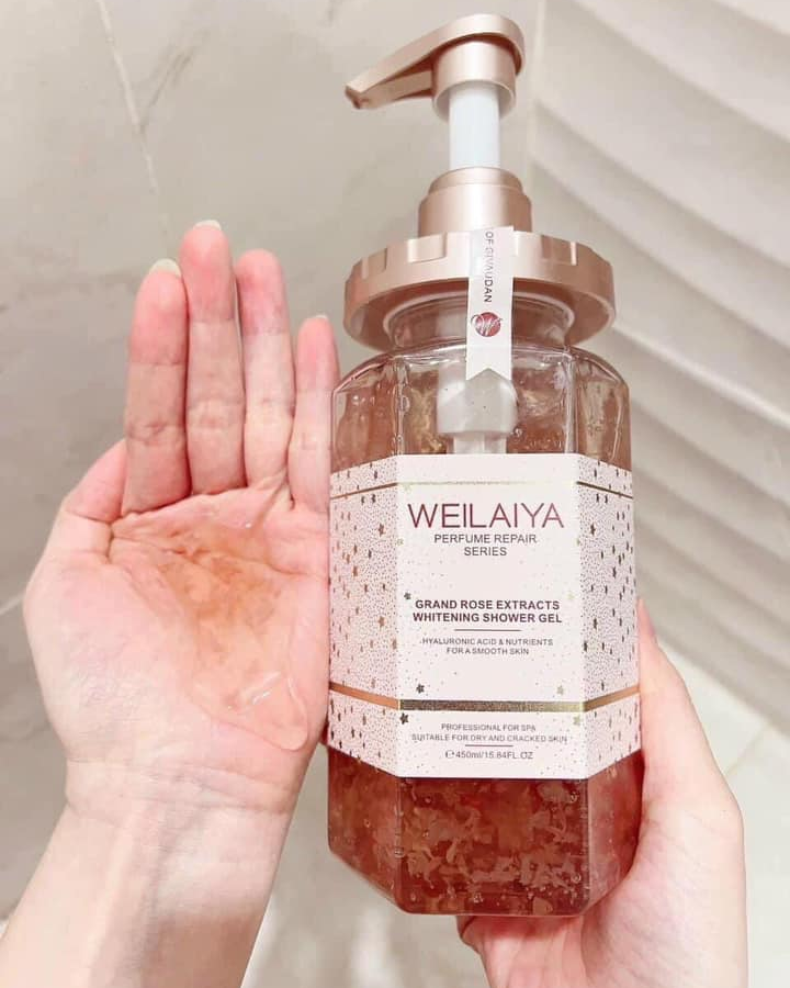 - Weilaiya Grand Rose Extracts Whitening Shower Gel với thiết kế sang trọng, độc đáo và ấn tượng chắc chắn sẽ đốn tim mọi cô nàng cùng công nghệ độc quyền bảo quản cánh hoa hồng tươi Damask nhập khẩu từ Bulgaria