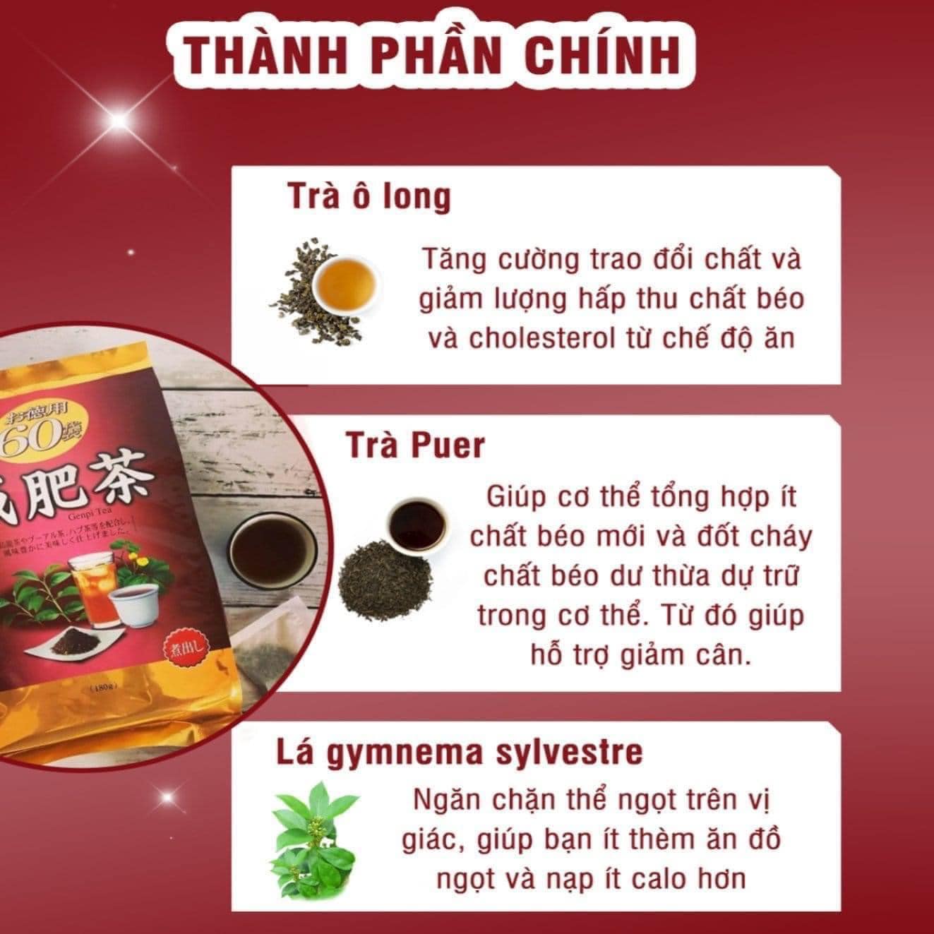 - Trà Genpi Tea có thành phần từ thảo mộc thiên nhiên, ngoài tác dụng giữ dáng, còn là một món trà ngon, giúp bạn thư giãn.